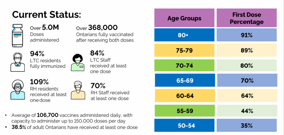 En Ontario se han administrado un total de 5'027.770 dosis de vacunas COVID-19. La provincia dijo que 365.166 personas han sido completamente vacunadas.
