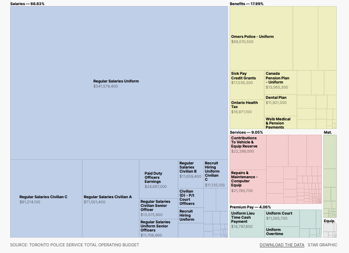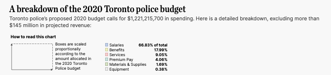 Pero los detalles más finos de cómo se gasta realmente ese dinero se revelaron recientemente. En agosto, en medio del ajuste de cuentas de este verano sobre raza y vigilancia, la policía de Toronto proporcionó detalles línea por línea del presupuesto operativo solicitado de $ 1.076 mil millones para 2020.