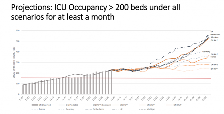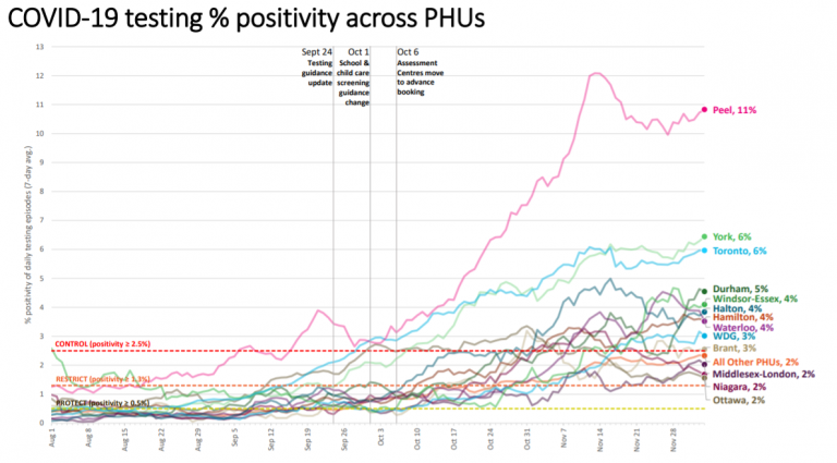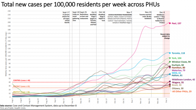 Brown señala que las recientes medidas de bloqueo aplicadas para Toronto y Peel no han tenido el mismo impacto que el primer bloqueo en marzo. Esto ha resultado en que los funcionarios de salud proyectan que los casos de COVID-19 totalizarán aproximadamente 2.500 por día para el 10 de enero, asumiendo una tasa de crecimiento del 1 por ciento.