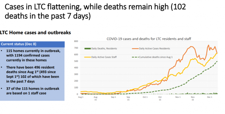 Hasta el 8 de diciembre, Ontario dice que actualmente hay 115 que informan un brote de COVID-19, con más de 1,000 casos. De los 115 hogares afectados por un brote, los funcionarios de salud dicen que 37 de ellos se basan en un miembro del personal que inicialmente dio positivo.