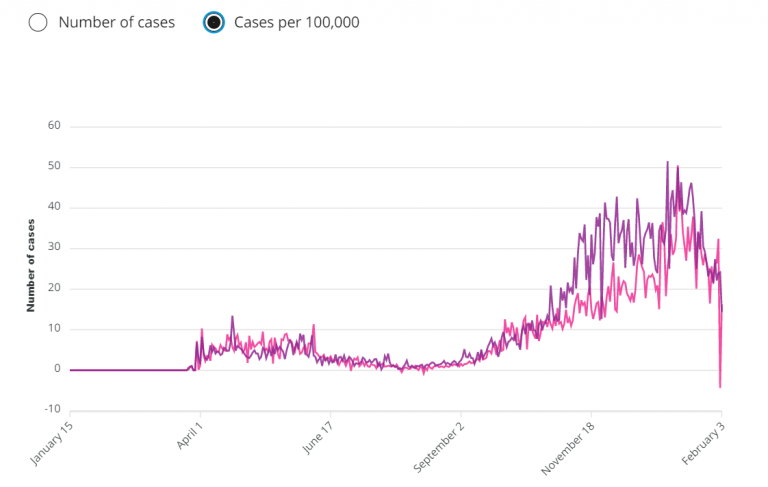 Según datos provinciales, al 3 de febrero, la provincia informaba 7.323 casos de COVID-19 relacionados con la escuela en las últimas dos semanas. De ese total, 5.131 fueron casos positivos en estudiantes mientras que el resto fueron miembros del personal.